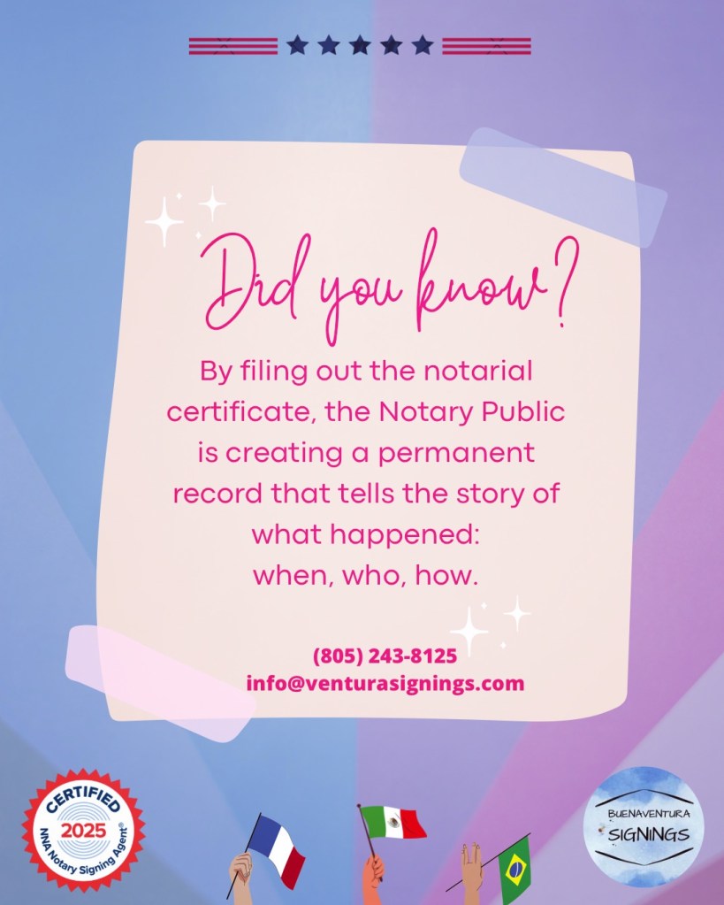 Because the certificate serves as the official legal record of the notarization, accuracy and proper procedure are critical. At Buenaventura Signings, we treat the integrity of every notarial certificate with the highest level of care. We never backdate notarizations, select certificates on behalf of signers, or notarize incomplete documents. Each notarization is performed with strict attention to compliance, professionalism, and detail.